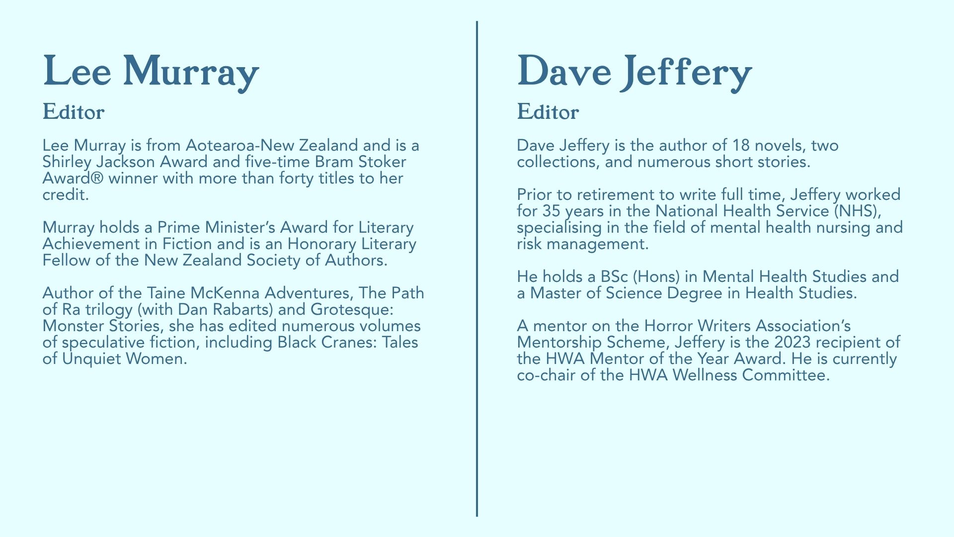 With accompanying one-page author vignettes revealing the author’s reflections & personal experience that inspired their work, the book offers a valuable benchmark resource for horror creatives while also offering insights for scholars, social groups, and practitioners… and solace for sufferers.