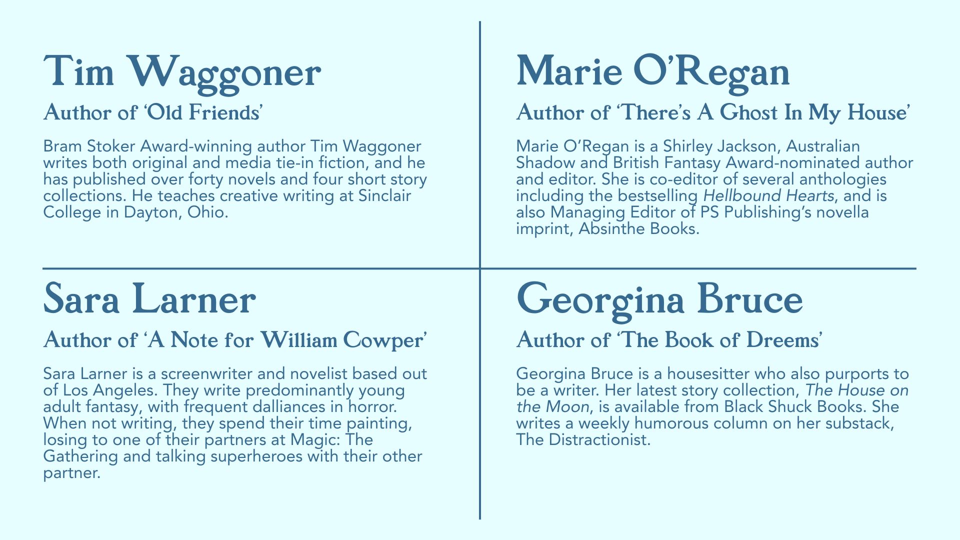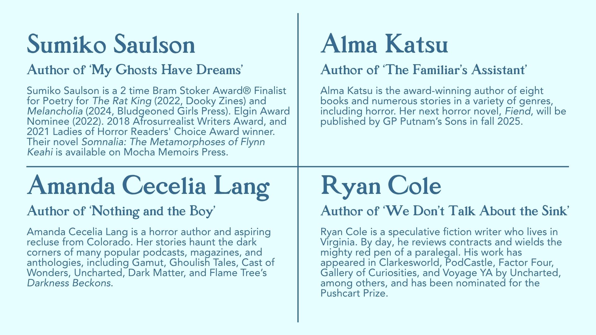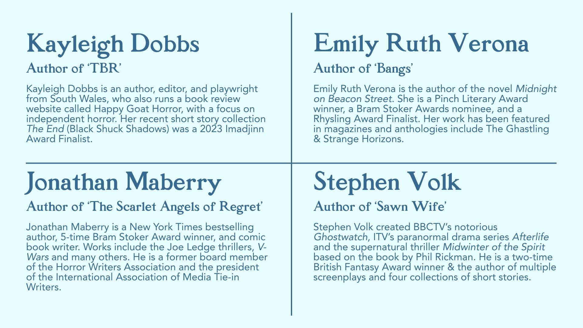 A discussion on the Horror Nerds at Church Podcast, hosted by Pace Dubbs and Pastor Emily, featuring contributors Callum Rowland, Sara Larner, and Alan Baxter.